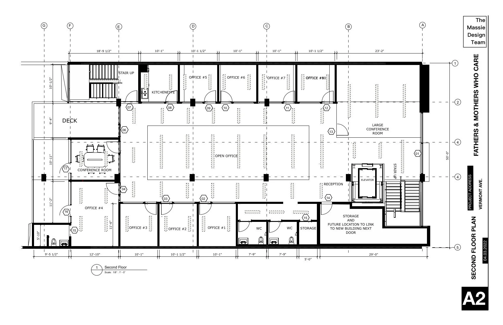 The Headquarters for Fathers and Mothers Who Care provides temporary rooms training for Neighborhood men that need assistance post incarceration or homelessness. It has the potential to be a beacon rather than a place of shame. Providing an open air roof deck with a bbq area with tables, private rooms, showers and restrooms.